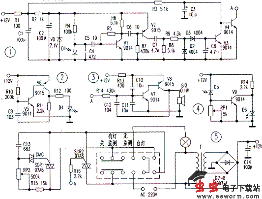台灯、电源、功能选择电路:(1)台灯: SCRl与灯光串联,C13、RP2、R15、DIAC组成触发电路,调节RP2,即可改变SCRl的导通角,达到调光目的。此时变压器断电,其他电路不工作。(2)无监测:变压器不接入电路,交流电源只供给灯泡,且不调光。(3)有灯监测:交流电源一路供给变压器,另一路经SCR2、SCRI串联后送给灯泡, SCR2受A点的控制。(4)关:灯泡与变压器全部无电,台灯不工作。