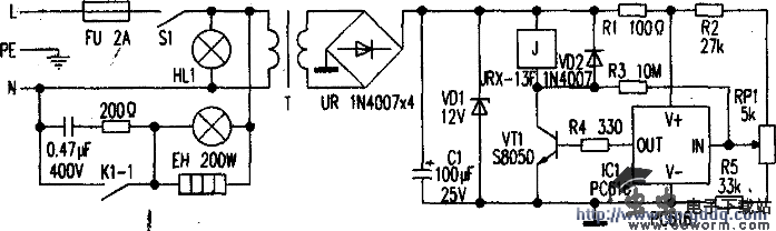 接通电源,闭合电源开关S1,变压器T次级输出约12V交流电,经整流桥UR整流、电容C1滤波、稳压二极管VD1稳压后为继电器供电。同时该直流电源经电阻R1限流后为温度控制电路供电。