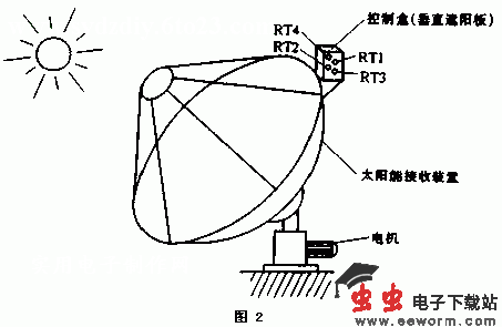 整个太阳能接收装置的结构如图2。兼作垂直遮阳板的外壳最好使用无反射的深颜色材料,四只光敏电阻的参数要求一致,即亮、暗电阻相等且成线性变化。安装时,四只光敏电阻不要凸出外壳的表面,最好凹进一点,以免散射阳光的干扰;垂直遮阳板(即控制盒)装在接收装置的边缘,既能随之转动又不受其反射光的强烈照射。凋试时,首先不让太阳直接照到四只光敏电阻上,然后调节RP1、RI2,使LM358两正向输人端的电位相等且高于反向输人端0.5V-1V。调试完毕后,让阳光照到垂直遮阳板上,接收装置即可自动跟踪太阳了。