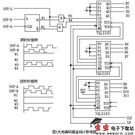 当光电编码器顺时针旋转时,通道A输出波形超前通道B输出波形90°,D触发器输出Q(波形W1)为高电平,Q(波形W2)为低电平,上面与非门打开,计数脉冲通过(波形W3),送至双向计数器74LS193的加脉冲输入端CU,进行加法计数;此时,下面与非门关闭,其输出为高电平(波形W4)。当光电编码器逆时针旋转时,通道A输出波形比通道B输出波形延迟90°,D触发器输出Q(波形W1)为低电平,Q(波形W2)为高电平,上面与非门关闭,其输出为高电平(波形W3);此时,下面与非门打开,计数脉冲通过(波形W4),送至双向计数器74LS193的减脉冲输入端CD,进行减法计数。 [!--empirenews.page--]