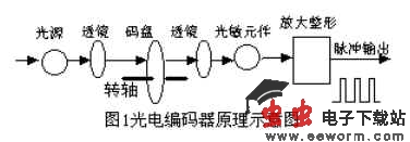 光电编码器,是一种通过光电转换将输出轴上的机械几何位移量转换成脉冲或数字量的传感器。这是目前应用最多的传感器,光电编码器是由光栅盘和光电检测装置组成。光栅盘是在一定直径的圆板上等分地开通若干个长方形孔。由于光电码盘与电动机同轴,电动机旋转时,光栅盘与电动机同速旋转,经发光二极管等电子元件组成的检测装置检测输出若干脉冲信号,其原理示意图如图1所示;通过计算每秒光电编码器输出脉冲的个数就能反映当前电动机的转速。此外,为判断旋转方向,码盘还可提供相位相差90旱牧铰仿龀逍藕拧。