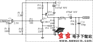 放大器的工作过程是:输入的视频信号经电容C1隔直流后,加在Q11的输入端b、e之间,经Q11放大后,将集电极电阻R12上的电压加到Q12的输入端e、b之间,经Q12放大后,以集电极电阻R16上的电压作输出。这两个晶体管都工作在共发射极放大状态,而且两级的工作点互相配合,使输出电压具有较大的变化范围。此放大电路的特点是信号失真小,放大倍数比较高,温度稳定性好,输入阻抗高,输出阻抗低。