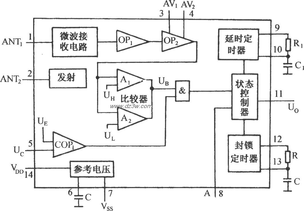 用RD9481多普勒效应传感器的电动机自动启动电路 电路如图所示。它包括多普勒效应传感控制电路、可控硅控制电路、音乐发声和放,大电路、交流降压整流电路等。多普勒效应传感器集成电路RD9481是电路的核心器件,其内部功能框图如下图所示。