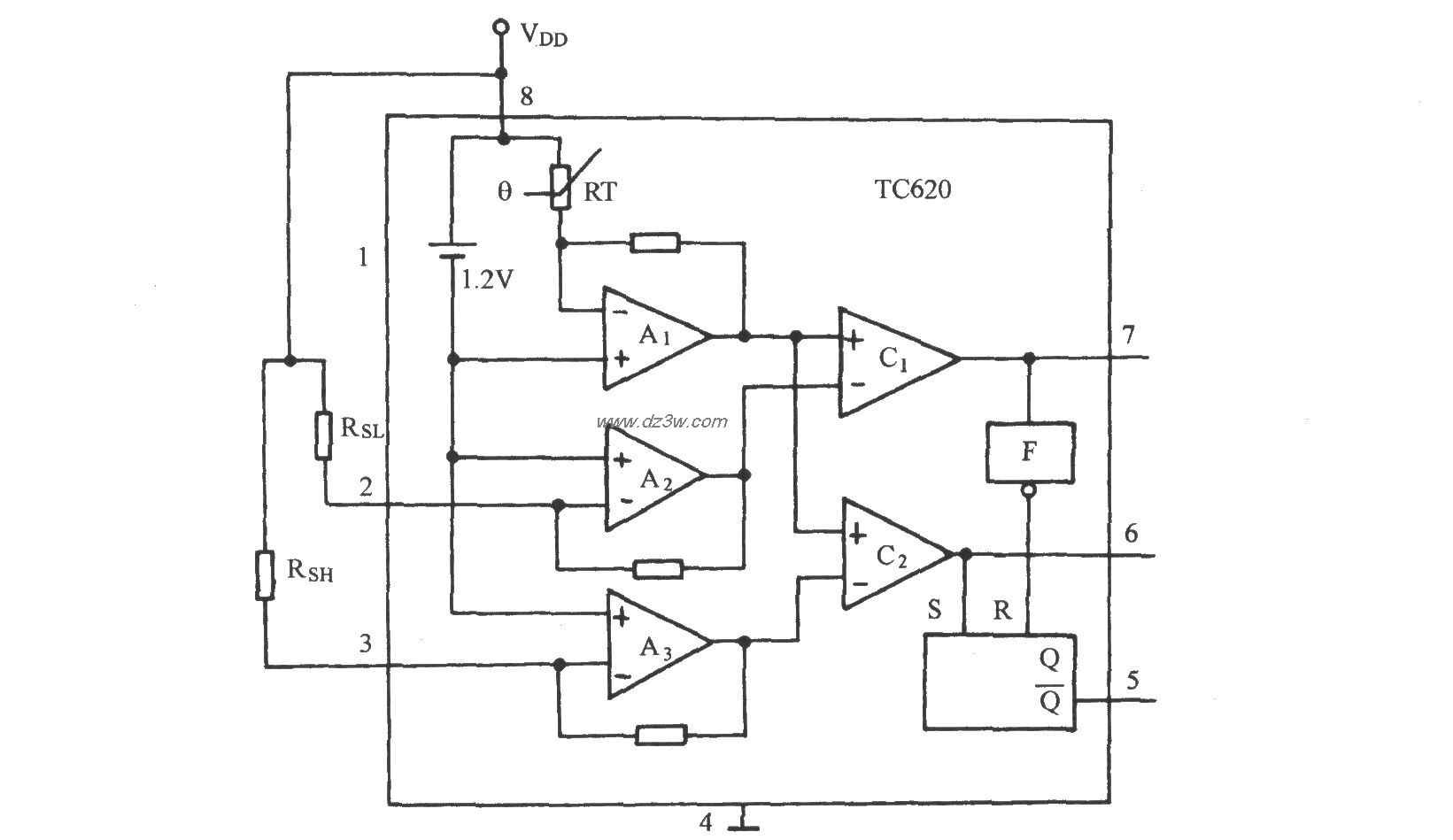 TC620温度传感通风降温自动控制电路 如图所示电路是使用TC620温控集成电路制作的风扇恒温自动控制电路。它包括TC620温控风扇电机电路、乐曲发声电路和音频功放电路等。TC620内含一个PTC热敏电阻温度传感器、微信号放大器、逻辑电平比较器和SR触发器等,下图是其功能框图。