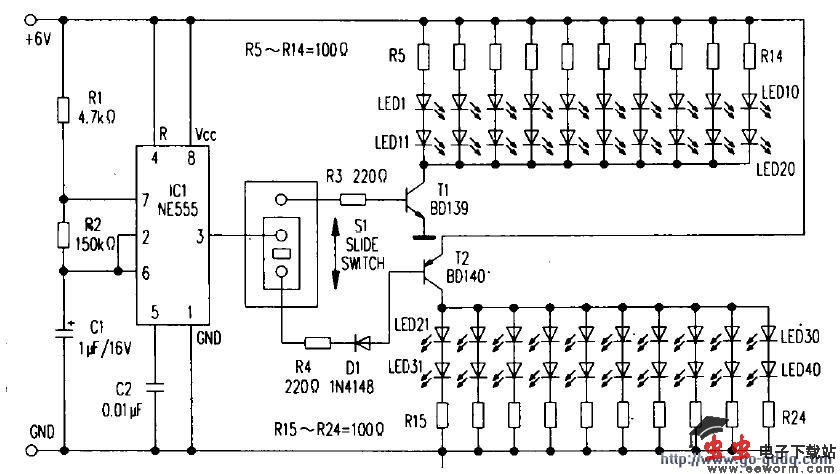 下图所示的多谐振荡器组成的闪烁器电路,LED聚光器的接通时间约108ms,截止时间约105ms,振荡频率为5Hz。在BD140的基极上串有一只二极管,以增加正向电压,确保BD139导通时,BD140截止。选择的LED耗电流较低(20mA左右),但能正常闪亮。