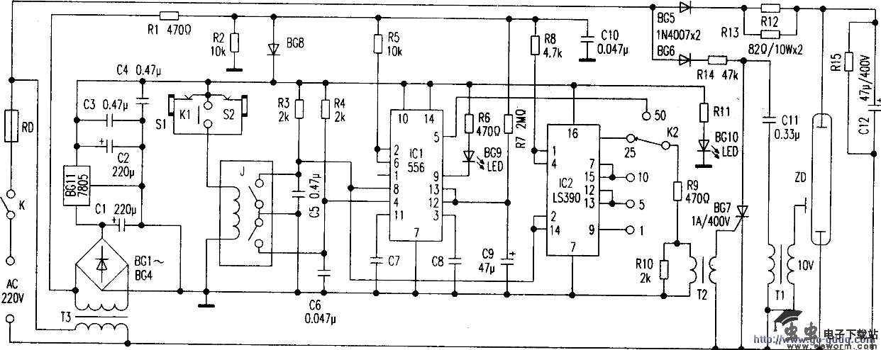 经IC2双十分频器分别分频为25Hz、10Hz、5Hz和1Hz方波,由波段开关K2选择。再经分压器R9、RlO、隔离变压器T2,于交流电压过零时,形成尖脉冲输出,去触发可控硅BG7。