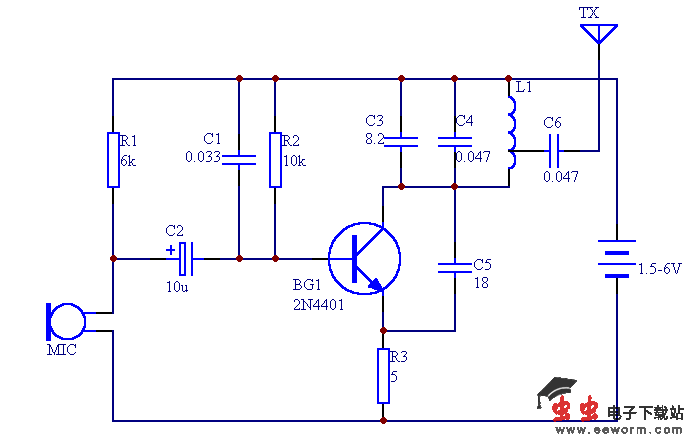 选择BG1时,管子的fT必须大于300MHz,但fT太高会影响调制,电感L分作两个线圈来绕制,但绕向必须相同,L1用直径0.5mm漆包线在直径5mm骨架上绕4匝,L2绕3匝。天线可用一根0.6米长的软导线。
