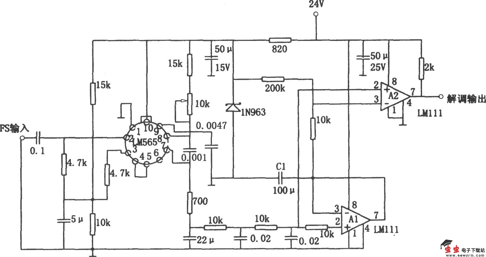 如图所示为灵敏的频率解调电路。该电路采用锁相集成电路LM565构成,能在很宽的频率范围内跟踪频率偏移。但是,对于频偏较小的信号,由于解调输出信号小,压控振荡器的漂移将会造成比较器工作点的漂移而产生误差。本电路为克服上述缺点,在电路上加有直流再生部分,因而对于频偏小的信号也能稳定工作。图中,LM565和比较器LM111构成的解调电路和一般的频率解调电路基本上是相同的。所不同的是,该电路中A2③脚输入信号不是从LM565⑥脚取出,而是从峰值保持电路A1取出。在调频输入信号的间隔内,A1的输出为低电平,于是保持电容C1通过A1的低输出阻抗放电,并保持信号峰值。采用这种直流再生的办法,尽管压控振荡器存在漂移,但峰值保持电路的输出可以跟踪,因此,比较器可以正常工作。