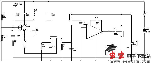 这里介绍的调频对讲机电路在开阔地的对讲距离大于100m,并可与调频收音机配合作无线话筒使用。 电路如图所示。三极管V和电感线圈L1、电容器C1、C2等组成电容三点式振荡电路,产生频率约为100MHz的载频信号。集成功放电路LM386和电容器C8、C9、C10、Cll等组成低频放大电路。扬声器BL兼作话筒使用。电路工作在接收状态时,将收/发转换开关置于“接收”位置,从天线ANT接收到的信号经三极管V、电感线圈L1、电容器C1、C2及高频阻流圈L2等组成的超再生检波电路进行检波。检波后的音频信号,经电容器C8耦合到低频放大器的输入端,经放大后由电容器Cll耦合推动扬声器BL发声。 电路工作在发信状态时,S2置于“发信”位置,由扬声器将话音变成电信号,经IC低频放大后,由输出耦合电容Cll、S2、R3、C4等将信号加到振荡管V的基极,使该管的bc结电容随着话音信号的变化而变化,而该管的bc结电容是并联在L1两端的,所以振荡电路的频率也随之变化,实现了调频的功能,并将已调波经电容器C3从天线发射出去。