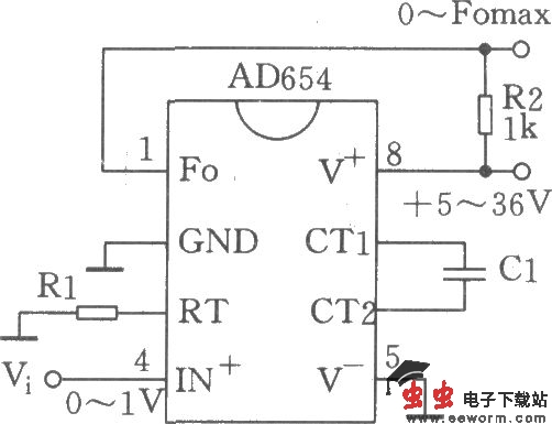 如图是用AD654的低成本压频变换器(VFC)。只要按图连接必要元件Rl和Cl,就可以成为VFC应用电路。电源电压可低至4.5V仍能保证性能,保证性能至l6.5V,耗电最大3mA(空载)。最高频率520kHz。输入电压范围限于0~4V。输入量程Vi由电阻Rl决定,即Vi/Rl=lmA。例如Vi=0~1V取用Rl=lkΩ,Vi=0~5V选用Rl=5kΩ。输出对应频率范围由Cl决定,Fomax=l/l0Cl,频率单位kHz,Cl单位用μF。例如,Cl=0.1μF,则输出频率为0~lkHz;Cl=0.001>F,输出频率范围为0~l00kHz。