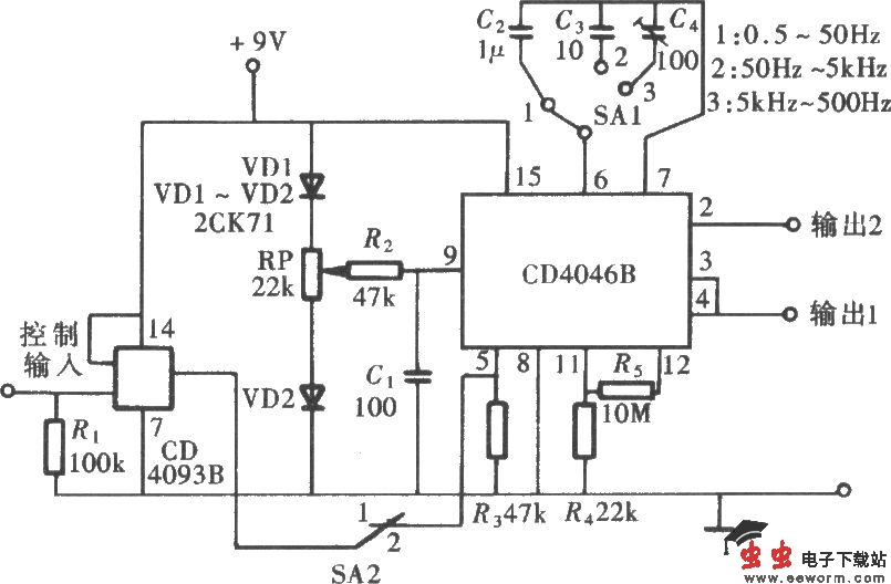 CD4046的工作频率最高可达1MHz,通过对其外接RC元件参数的设定,可以组成一个宽频带的方波信号发生器,其电路组成如图所示。