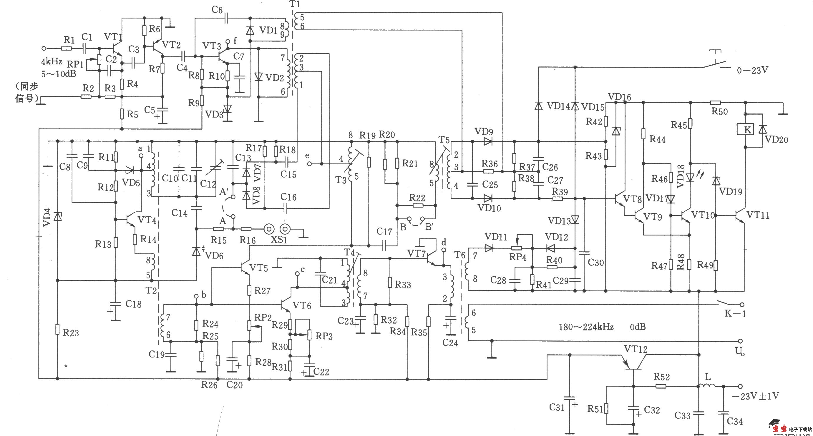 电阻Rl、R48:3.9k、R2、R3、R8、R25、R32、R47:10k,R4、R9、R49、R52:3.3k,R5、R36:2k,R6、Rl9、R33、R41:20k,R7:24k,Rl0:110Ω,Rll:4.7k,Rl2:750Ω,Rl3、R23、R31、R50:1.3k,R14:560Ω,Rl5、Rl7、Rl8、R37、R38:510k,Rl6:910Ω,R20:16Ω,R21(参看下表),R22、R30:lk,R24、R29:300Ω,R26、R34、R43:2.7k,R27:180Ω,R28:1.5k,R35:240Ω,R39:300k,R40:1M,R42、R46:9.1k,R44:4.3k,R45:5.1k,R51:100k。电阻型号均采用RTX-0.125W即可。电位器RPl:4.7k,RP2:150Ω,RP3:680Ω,RP4:2.2kΩ。电容Cl、C3、C7、Cl5、Cl6、C26~C29:0.047pF,C2、Cl9、C30:0.1μF,C4:510pF,C5、C8、C9、C20、C21~C24:5μF30V,C6:2400pF,Cl0(调测时选用),Cll、Cl4、Cl7、C21、C25,参考下表,Cl2:20pF,Cl3:680pF,Cl7:5500pF,Cl8,C31、C32:50μF30V,C33、C34:0.22μF。二极管VDl、VD2、VD5、VD7~VDll、VDl4、VDl5:2CKl8或2CK72C,VDl2、VDl3、VDl7、VD20:2CPl4。稳压管VD3、VDl6:2CW5(工作电流6mA,稳压12.5±0.5V),VD4:2CWl4(电压6.8±0.2V),VDl9:2DW7C。变容二极管VD6i 2CC5。发光二极管VDl8:BT-201。三极管VTl、VT4~VT6、VT8~VTl0:3DG6C、β=85~115,VT2:3AG43、β=50~85,VT3:3DK28、β=65~115,VT6、VTll:3DGl28、β=65~115。继电器K:]RW-3M。电感L:LH2A-直-220μH(色码电感)。脉冲变压器Tl:型号MX0-200,Ll-3、绕制12匝,L2-3、L4-5、L6-7、L8-9均绕24匝,均选用Φ0.21mm高强度漆包线。振荡变压器T2:型号为L22AL=100,L3-4、绕66匝,L1-4绕98匝,L6-7、绕8匝,L5-8、绕4匝,均选用Φ0.21mm高强度漆包线,Ll-3=2.7mH。缓冲放大变压器T3:型号为Ml8AL=100,L4-5、绕45.5匝,L4-8、绕30.5匝,均选用Φ0.27mm高强度漆包线,554μH≤L5-8≤583μH。输出变压器T6:型号为T22AL=2800,Ll-4、L3-4、绕64匝,L5-6、绕4匝,L7-8、绕27匝,均选用Φ0.23mm高强度漆包线,Ll-3≥45mH。告警鉴相变压器T5:型号为Ml8AL=100,L3-2、L3-4、绕70匝,L5-8、绕l2匝,均选用40.23mm高强度漆包线,1.88μH≤L4-2≤1.98μH。前置放大变压器T4:型号为Ml8AL=100,Ll-4、L3-4、绕43匝,L7-8、绕53匝,均选用40.17mm高强度漆包线,710μH≤Ll-3≤747μH。