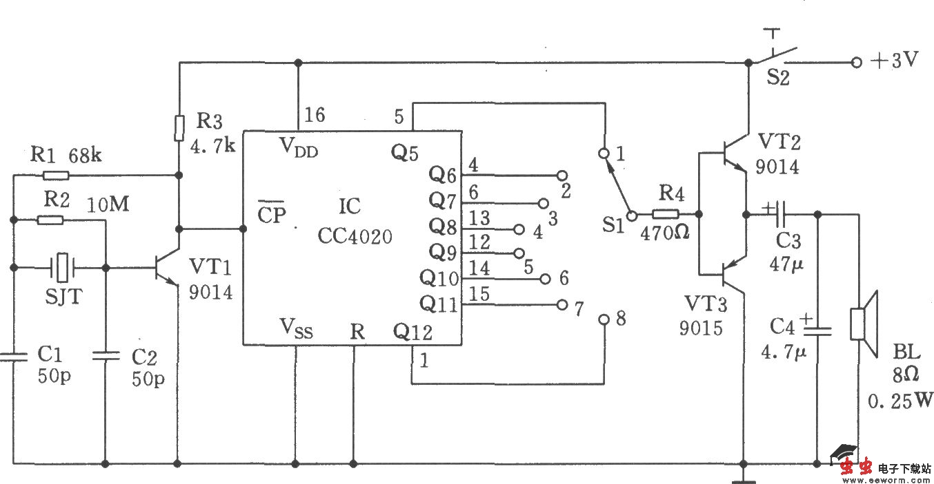 IC:CC4020为国产的,也可选用国外型号CD4020或MCl4020等直接换用。三极管VTl、VT2:9014、β=150~250,VT3:9015、β=150~250。VT2和VT3也可选用其它型号的三极管,但必须同为锗管和硅管,并尽可能参数一致。石英晶体SJT:型号为ZWB-1MHz。开关S1(波段开关):KZX-1-1D-9W。S2:KNX(1×1)。电阻标称功率均采用1/8W金属膜电阻。其他元器件参数值如图所示,无特殊要求。