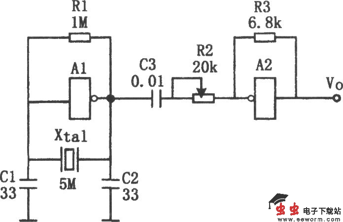 如图所示为反相器构成的正弦波发生电路。该电路可获得几兆赫以上高稳定性的正弦波。图中A1和晶振组成振荡电路,A1的输出再经缓冲器A2后输出正弦波信号。电路中,A1为线性放大器,整个电路工作于放大状态。由于采用的晶振特性不同.电路输出频率和电压有所不同,而R2可用来进行波形调整。为了获得准确的振荡频率,可在电容C1两端并联半可变电容进行微调。电路的振荡频率由晶振决定,改变晶振可改变输出信号频率。