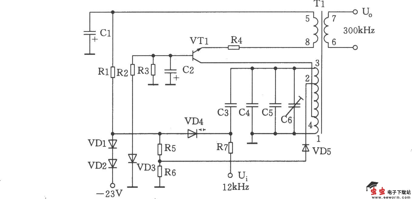 如图所示为300kHz信号发生器。它由VT1、T1、VD4及相关元件组成压控振荡器。压控振荡器采用LC集电极调谐式,VTl为振荡管,由变容二极管VD4、电容C3~C6和变量器T1的1~3绕组的电感组成调谐回路,变容二极管VD4反偏工作,来自控制电压加于负端,以改变其电容量。振荡信号由Tl的6~7绕组输出。其中,C6是频率微调电容。VD3稳定振荡级工作电压,稳定电压为6.8V±0.2V。