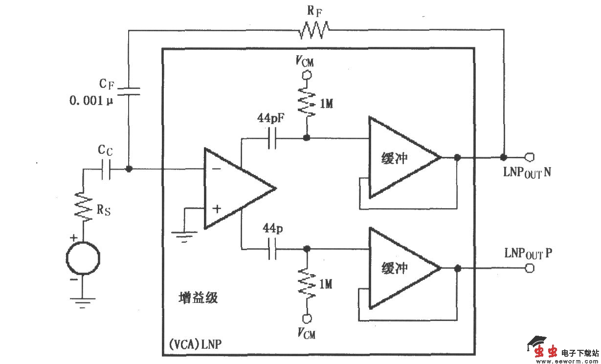如图所示为VCA2613/2616的低频LNP时间常数电路。为了避免低频不稳定或过载等问题,在应用VCA2613/2616时可用增加外部并联反馈元件RF、CF的方法,减小整个反馈回路电阻以增大反馈量,来解决低频不稳定或过载问题。建议设置RFCF的时间常数约为5μs。