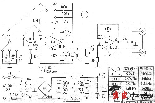 用作振荡器的运放,其振荡频率最好在运放频率参数的十分之一较为可靠。这里采用频带宽度达15MHz的单运放LM318,有条件的话可用八脚金封的,不过笔者采用的是双列直插(DIP)塑封的集成块。