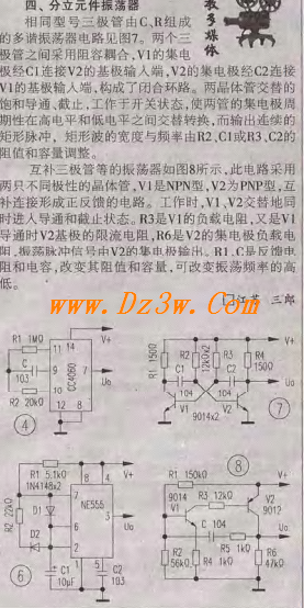 多谐振荡器是一种自激振荡器,在接通电源后,不需要外加触发信号,能自动地产生矩形脉冲。它是常用的矩形脉冲产生电路。 多谐振荡器有电容正反馈多谐振荡器、带RC定时电路的环形振荡器、施密特触发器构成的多谐振荡器和晶体稳频的多谐振荡器等类型. 一、数字(CMOS)芯片 1 . TC4069 六反相器振荡器用 TC4069 和石英晶体制作的多谐振荡器电路见图 1 所示。石英晶体最大的特点是当信号频率等干晶体谐振频率时,等效值最小,信号容易通过,在电路中形成正反馈,因而电路振荡频率决定晶体频率.与电路中其他元件无关。只要更换不同的晶体,就可以得到不同的振荡频率. 2 .采用相同的 TC4O69 振荡器 Rl,R2、C组成的多谐振荡器见图 2 。电路中由于 C 的充、放电作用,使两个暂稳态中交替转换,输出矩形脉冲.其工作电压可选取 3V-18V 。改变R2、C的大小,可改变振荡频率。 R1是补偿电阻,可改变电源电压波形而产生振荡频率不稳. 3 . CD40106 六施密特触发器用 CD40106B 、 R 、 D 、 C 组成的多谐振荡器见图 3 。利用 Dl 、 D2两只二极管的单向导通特性.分别形成充、放电回路,使输出矩形脉冲电路中的高、低电平持续时间不同,占空比得到调节。改变R1,R2的阻值和C的容量.可使振荡频率发生变化。施密特触发器输出端所接的反相器起到整形、隔离作用。 4 . CC406014 位二进制串行计数器/分倾器/振荡器用 CC4060、Rl、R2和C组成的多谐振荡器见图4。CC4060内部分为两部分: ( l )是 14 级计数器汾频器,其分频系数为2e4-2e16,即为 16-16384 ; ( 2 )用外接电阻、电容构成多谐振荡器,产生较高的频率信号,经其内部分频后.从输出端 Q4 - Q14 输出 4-4 次二分频后较低的、准确的频率信号。 二、 LM324 四运算放大器振荡器 用 1 / 4 的LM324 等组成的多谐振荡器电路见图 5 。该运放工作在电压比较器状态。正反坡网络中的R2、R4 对输出电压U0分压后,作为同相输人端 ③ 脚的基准电压 V + ,反相输人端 ② 脚V-取自R3、C组成的积分电路 C 两端,V-与V+进行比较,而决定愉出电压 Uo 电平的高低。由于 C 不断在正、反两个方向充电和放电,使V-的电压不断大于V+和小于V+ ,输出电压 Uo 也随之在低、高电平之间翻转,就会得到一定周期和频率的方波信号。该振荡器般大特点:温漂小,频率稳定性高。其振荡频率与 R3 、 C 的阻、容值有直接关系,与所用的运算放大器特性无关. 三、 NE555时基集成电路振荡器 采用 NE555 时基集成块及外接限、容元件组成的多谐振荡器电路见图 6 。此电路主要是C1充电来维持第一个暂稳态,其持续时间为输出正脉冲宽度 TWH , 依C1的放电维持第二个暂稳态,其持续时间为输出负脉冲宽度TWL 。电路起振后C1两端电压总是在1/3-2/3V+之间变化。电路中的 Dl 、 D2 是将 Cl 电容的充放电回路隔离。通过改变 R2 的阻值,可使 TWH及TWL得到改变,占空比得到调节。