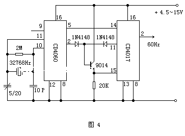 图5是由一片CD4060构成的60Hz的时基信号发生器。相对前几种是最为实用的时基信号电路。