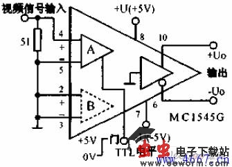 使用MC1545的视频开关电路如下图所示,MC1545为门控宽带放大器,可用作视频开关。输入为差动方式,用门开关转换A、B两组放大器,高电平选择A,低电平选择B。输出也有差动式输出端子。门输入信号为TTL电平,能道选择转换时间为20ns。当门信号为高电平时,视频输入信号作为输出信号取出;门信号为低电平时,A放大器处于关断状态。图中以A为例,也可以用B,此时,4、5脚接地。2、3脚加输入信号。