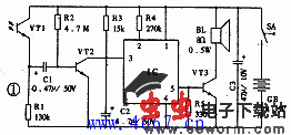 光控语音警示电原理图见图1。整个电路由光控电子开关和3秒语音集成电路两部分组成。图1中光敏三极管VT1和晶体三极管VT2,电阻R1、R2、R3和电容C1、C2等构成光控开关电路。语音集成电路IC及三极管VT3、电阻R4、R5等构成语音放大电路。图2是该电路的印刷电路板图。平常在光源照射下,VT1呈低阻状态,VT2饱和导通,IC的触发端③脚得不到正触发脉冲而不工作,扬声器无声。当VT1被物体遮挡时,便产生一负脉冲电压,并通过C1耦合到VT2的基极,导致VT2进入截止状态,IC获得一正触发脉冲而工作,输出音频信号通过VT3放大,推动扬声器发出声响。声响内容可根据不同场合选择不同的语音电路来产生,例如高压电网或配电房等场所,可选用“高压重地,禁止入内”、“有电危险,请勿靠近”等语音集成电路。