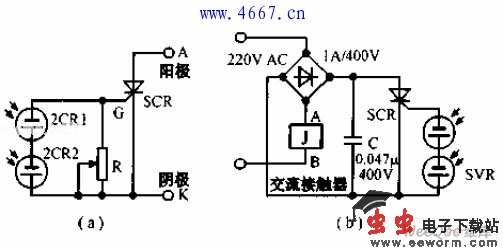 无电源光控开关电路如下图所示,通常的光控开关本身需要电源供电,虽然集成光控可控硅开关时不需要电源,但是难以满足灵敏度、高耐压等要求。(a)电路为无电源光控直流开关,其中2CR1、2CR2为密栅高速硅光电池,用于接收光信号,产生电压并输出电流。(b)电路为无电源光控交流开关,如果负载电流不大,可以不用交流接触器,将负载直接在交流接触器位置于。
