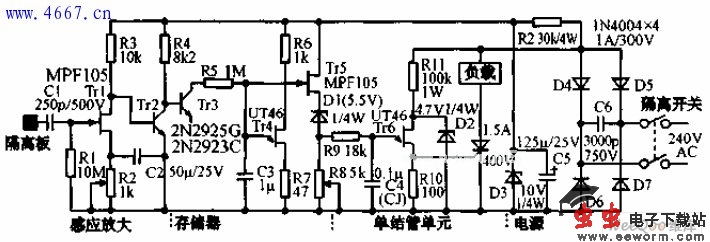分立元件触摸开关电路如下图所示,该电路由感应放大器、存储器、交流驱动器等组成。手指触摸绝缘金属板,一个小的交流信号加到Tr1的栅极,经放大在R4上产生方波,又经Tr3(相当于二极管)对C3充电,在R8上产生直流输出电压,此电压加到单结晶体管Tr6使之发生弛张振荡触发可控硅。触摸时间越长,R8上电压越大,移开手指负载断开。