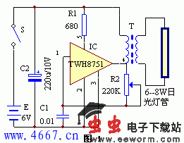 一般直流日光灯采用分立元件组成,而这个电路由TWH8751功率开关加几个外围元件组成,电路简单、可靠、效率高,可用于停电时或野外照明。