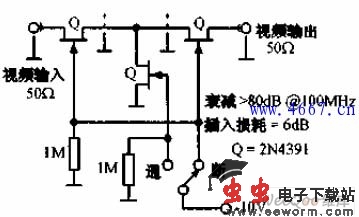 视频开关电路如下图所示,2N4391场效应管提供了只有30Ω导通电阻和小于0.2pF的夹断电容。这种性能可与理想高频开关相媲美。100MHz的电路衰减大于80dB,插入损耗约为6dB。