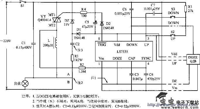 灯亮度通过uP和DOWN开关闭合来设置,R1、C2、DZ和C5为芯片提供15V的电压,R2和C4用作SYNC输入AC信号滤波和电流限制,C3用于IC内部PLL滤波,R3用于限制在按钮开关接通时脚VSS与uP和DOWN脚之问的电流,Cl和L组成射频干扰(RFI)滤波器,R4和。D2用于限制IC输出(TRIG)与双向晶闸管(VT)门极之间的电流,C6和C7用于消除在uP和DOWN输入上来自双向晶闸管的耦合开关瞬态噪声。