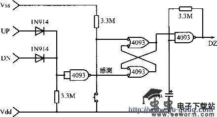 当使用DOZE电路时,可采用右图所示的电路。该电路的作用是,在DZ端上产生一个O.04Hz的慢时钟,输入到IC的DOZE脚。如果uP/DOWN输入不被激活,DOZE电路的感测节点处在一个逻辑高电平上。瞬时按下DOZE开关将置位:RS触发器,使振荡器赋能。DZ端上每个时钟的下降沿使灯亮度减小,直到灯熄灭。当灯关掉时,在调光器电路的振荡器不再起作用。当灯通过激活uP输入再一次导通时,RS触发器复位,并且DZ端上的时钟截止。当使用DOZE电路时,IC脚l与脚2之间的连接应断开。