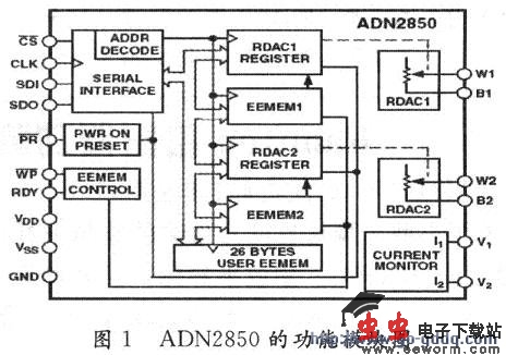 ADN2850是ADI公司的双通道,1 024阶非易失性数字电位器。温度系数仅为35 ppm/℃。其功能模块图如图1所示。它的输出电阻W和B之间的阻值主要由中间寄存器RDAC中存储的值决定。RDAC的值可以由外部指令直接赋予或者从内部非易失性存储器E2MEM中载入。E2MEM中的值可以被修改或者被保护。当RDAC中的值被改变后,新的值也可以被存入E2MEM中。之后,新的值将在系统重新上电后自动加载到RDAC中。