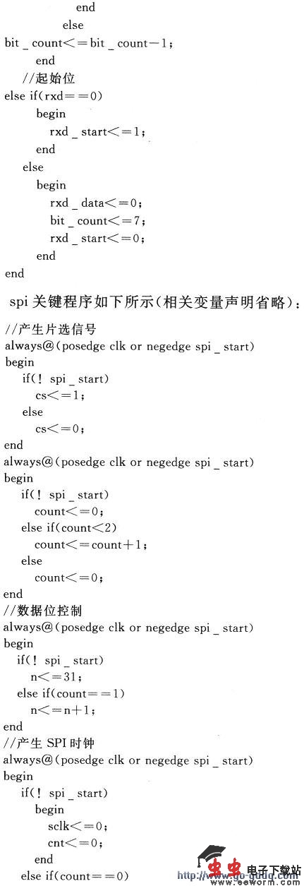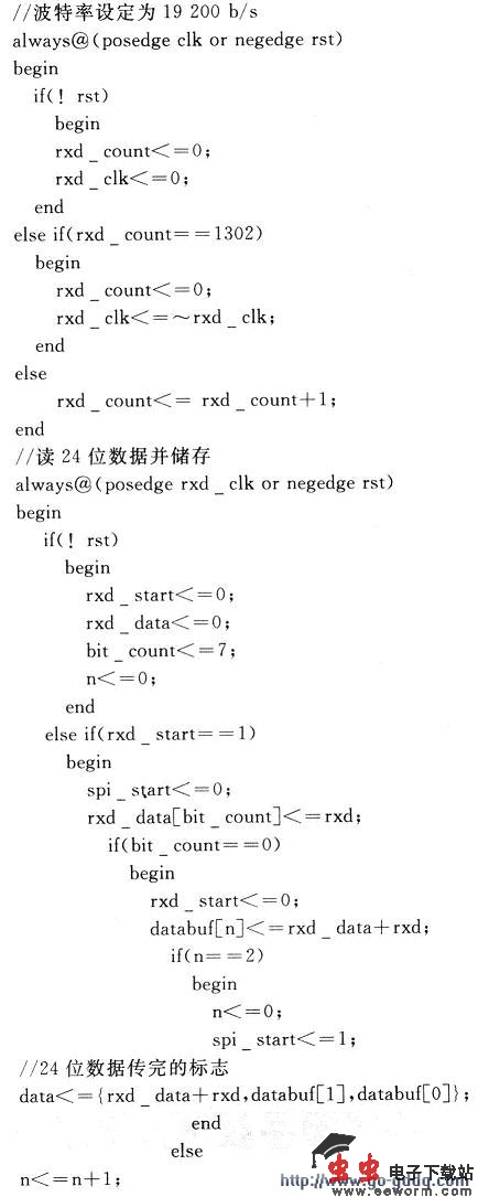 这里利用FPGA对SPI接口进行配置。为了方便对输入SPI的指令的随时改变,而不需要程序的重复写入,24位指令通过串口输入到FPGA。串口通信由微机上的串口调试助手协助进行。由于少了重新写入程序的时间,从而调试速度和效率明显增高。
