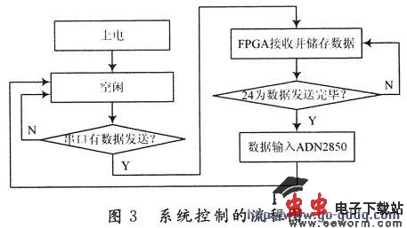 用串口控制ADN2850的流程图如图3所示。一旦有指令从串口发送,就重新经FPGA后写入ADN2850。