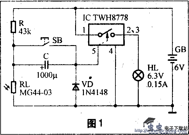 延时小夜灯的电路如图所示,它主要以一块功率开关集成电路IC(型号为TWH8778)为核心器件构成。TWH8778采用TO-220塑封包装,体积小,便于安装(外形参见图2),其内部电路可等效成为一个“电子开关”。“电子开关”的通断受5脚微触发电流(阈值正电压为1.6V)的控制,实测当电流大于30μA时,“电子开关”接通,HL点亮;当电流小于30μA时,“电子开关”断开,HL熄灭。