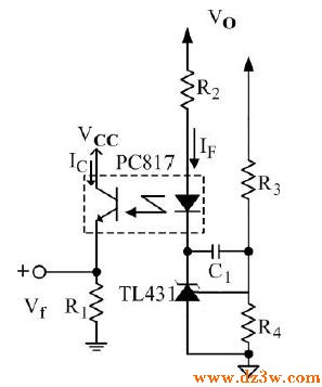 电源反馈隔离电路由光电耦合器PC817以及并联稳压器TL431 所组成,如图1所示,其中R2为光耦的限流电阻,R3 及R4 为TL431 的分压电阻,C1 作为频率补偿之用。光电耦合器的限流电阻R2 可由下式求得
