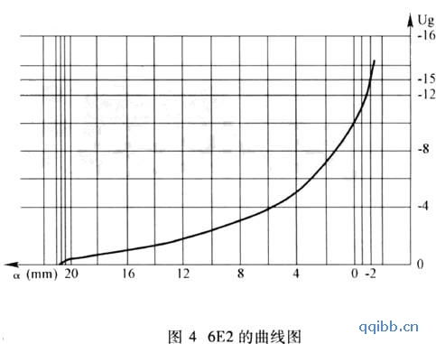一般而言像这样简洁的线路,笔者建议用搭棚焊接,一方面可以省去印板所花费用,且效果要好于印板(只要在电器市场买几个焊片架便可)。机箱建议用铝合金制的小盒子20mm×5mm×l2mm),在顶面打上两个大洞(用于安装管座)及一些固定孑L,再沿信号通路—,灯丝及指示—)高压整流—)霄型滤波—)接地的顺序安装好所有零件,如图3所示。检查几遍,确认无焊错、假焊、短路等不良现象后进人空载调试(不插电子管)。插上电源,开机后10分钟内如无冒烟、打火等异常现象,再用万用表测其高压,约300Vo然后插上电子管,30s后屏幕应出现绿色带,待其停止收缩后调W1及另一声道的屏极电阻,使两者处于同一高度。而后接上信号(并联在扬声器两端),此时绿色带会随信号大小而伸缩。用上几天后再复调一次便可顺利工作。如果您有兴趣的话,再用功率计校定,用油性圆珠笔于胆腰上写上功率值便可。图4是6E2的控制栅与暗区长度关系的曲线图,其管脚排列见图5所示。