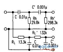 计算后面的一阶RC网络时,R值一般比它前面网络中的R值大(5~10)倍,电容值则小(1/5~1/10)。本例按10倍和1/10计算。后级的R'值对高通滤波器和低通滤波器分别为R'h和R'L: