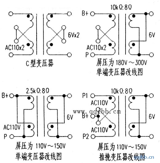 此法比较简单,将C型变压器初级中心连线引为连接B+电压的抽头,次级(中心连线断开)同名端相连(即并连)即可,不需拆开铁芯。有关阻抗及用管范围见附表。改制接线图见附图。