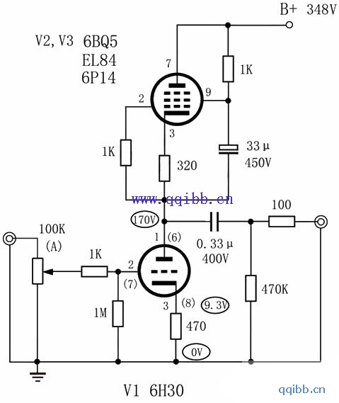 工作点的测量:各点的电压如图所示,B+ 348V,6H30对地的屏极电压 170V,阴极电压:9.2V,计算得出屏极电流Ip=19.6mA。基本和设计工作点吻合。