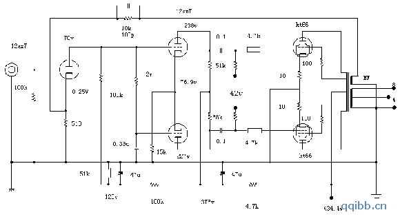 KT66后级全景。本机的电路如下:12AX7+12AU7+KT66