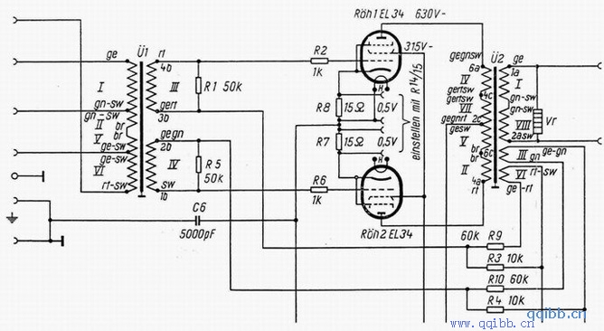 调节功率管的静态电流,可使用R14和R15的50K可调电位器 图(3),调节流经输入牛次级线圈所带的负电压,因此可控制功率管的导通静态电流。我们可量度R7和R8的15Ω阴极电阻,调至0.5V DC,若以欧姆定律计算,电流I =电压V除以电阻R,即是0.5除以15Ω等于0.033A,通常胆机常用微安 mA表示,即是每支EL-34的使用电流是33ma。一般的DYNACO或Marantz都是50ma左右的电流,由此可见Siemens可在每支EL-34处33ma时可有50W的有效值功率,是一般人难以想像的;又因低电流工作,在长时间专业系统使用中,都有可靠和耐用的信赖。