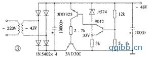 稳压电源中的调整管采用了国产锗晶体管3AD30C,要求其电流放大系数不低于70。稳压电路虽然为集电极输出电路,但由于锗管的穿透电流比较大,故可不必另外设置启动电路。调整管的集电极也可以直接接地。稳压二极管采用μ574,是彩电中专门用于稳定高频头调谐电压的集成电路,效果很好。同时还要调整取样电阻,使输出电压为+38V,电源变压器的次级电压也应降为43V左右。