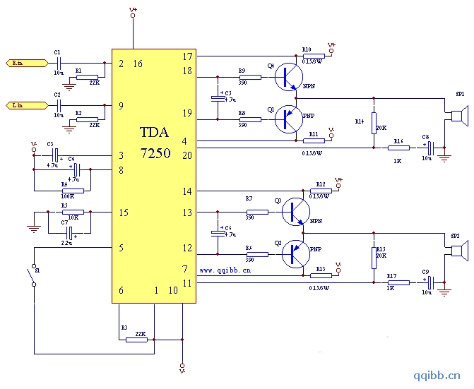 ·外围电路简单,制作方便; ·支持电压范围宽:2V-90V(±10V-±45V); ·具有不需要温度补偿的零漂控制电路; ·功率晶体管过流保护; ·静噪/待机功能; ·耗电量少; ·低谐波失真:PO=40W、fo=1KHz时谐波失真=0.004% ·输出功率60W/8Ω、100W/4Ω。