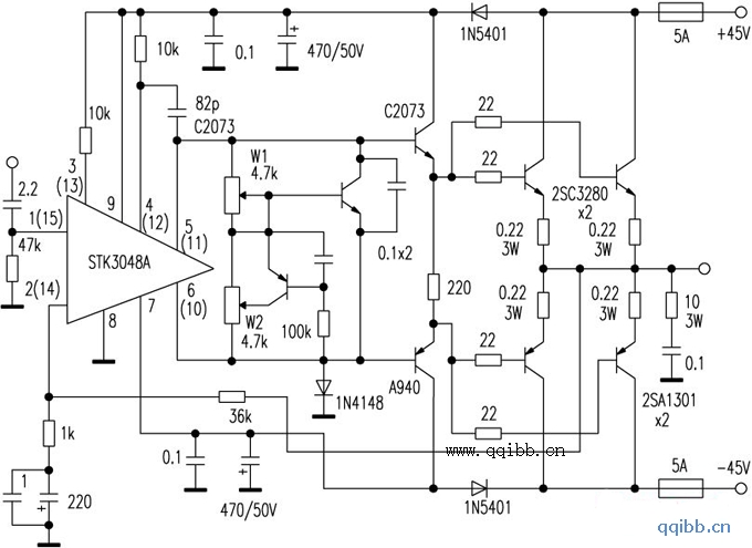 集成电路STK3048供电电压高,动态范围大,用于制作滑动甲类功放的电压放大级,简化了电路,调试简单。