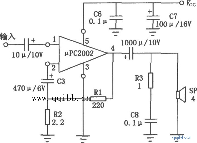 μPC2002是音频功率放大集成电路,采用5脚单列直插塑料封装,按引线的形状可分为H型与V型。该电路输出功率大、失真度小,噪声低,开机时冲击声小,并具有电源浪涌、过电压和负载短路等保护电路,因而广泛用于汽车立体声收音机、录放机中作音频功率放大器。其典型应用电路如图所示。
