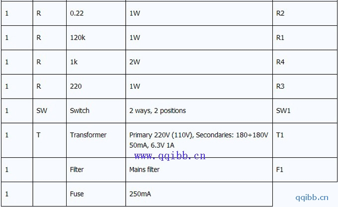放大器电路元件表: