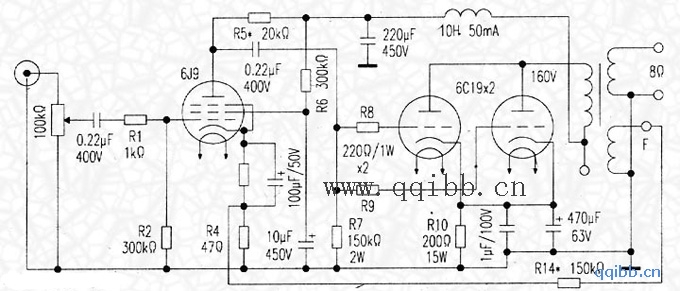 3)6C19阴极电阻R10的调整。根据40V(阴极电压)÷220Ω(阴极电阻)=0.18A,0.18A÷2×(160V-40V)=10.9W,没有超过6C19的屏耗1 1W。如果电压有偏差,可以调整R10解决,总之要基本满足上述条件。R8、R9为防振电阻。