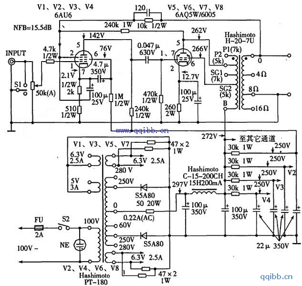 NFB回路分两路,一路是由输出管的屏极经240kQ电阻到初级管的阴极,反馈量为6dB,另一路取自于输出变压器次级81"1处,反馈量为9.5dB。