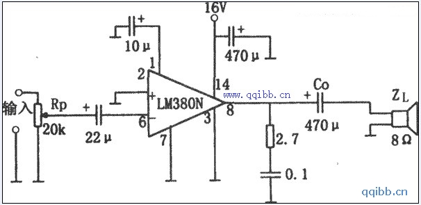 如图所示为2W音频功率放大电路。该电路采用了14脚封装的LM380作为放大器件,输入信号经音量控制电位器Rp(20kΩ)和22μF的耦合电容加到运放LM380的反相输入端(引脚6),其同相输入端(引脚2)接地,引脚1外接10μF的滤波电容,以滤除高频纹波干扰,电路采用16V单电源供电,并在电源端(引脚14)到地之间外接470μF的去耦电容,其输出端(引脚8)到地之间有两个并联支路:一支路由2.7Ω电阻与0.1μF电容串联组成,用于提高电路的稳定性,滤除部分高频,防止产生高频自激振荡;另一支路由470μF的耦合电容Co和负载ZL(8Ω喇叭)组成,Co和ZL决定了电路的下限截止频率fL。由图中的参数可得出其下限截止频率为: